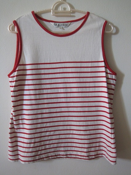 T005. 200 b. เสื้อแขนกุดลายทางสีแดง ผ้าใส่สบาย อก 38 นิ้ว ลำตัว 36 นิ้ว ยาว 22.5 นิ้ว