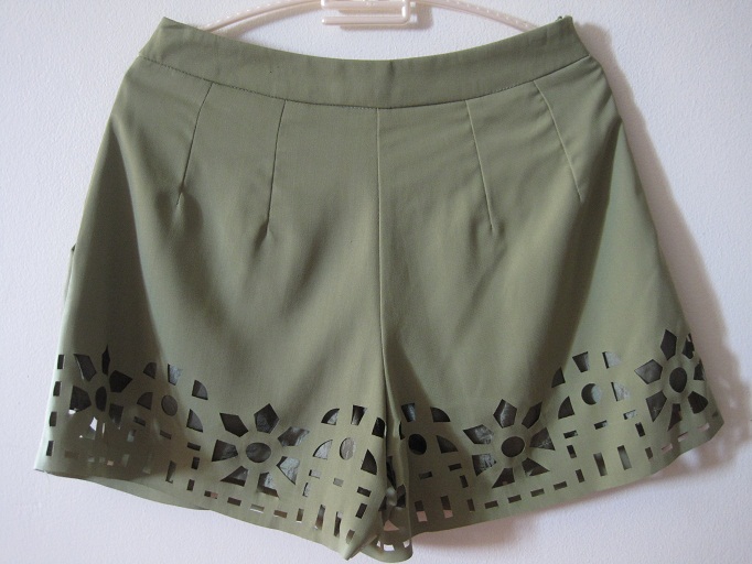 B002. 150 b. กางเกงขาสั้นสีเขียวผ้าเบาสบาย เอวสูง ดีไซน์สวย เล่นลายฉลุตรงปลายกางเกง สวยๆค่ะ เอว 28 นิ้ว สะโพก 40 นิ้ว ยาว 15.5 นิ้ว