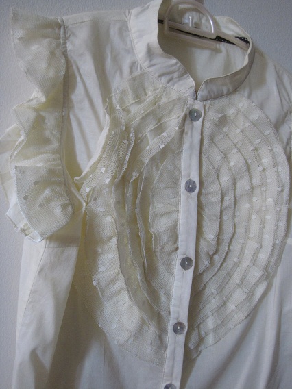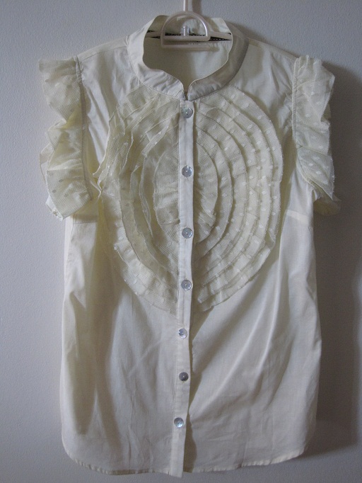 T006. SOLD เสื่อเชิ้ตสีครีม ดีเทลเก๋ ลายดอกไม้ตรงอก ใส่สูทหรือเสื้อคลุมทับก็สวยๆค่ะ อก 37 นิ้ว ลำตัว 36 นิ้ว ยาว 25.5 นิ้ว