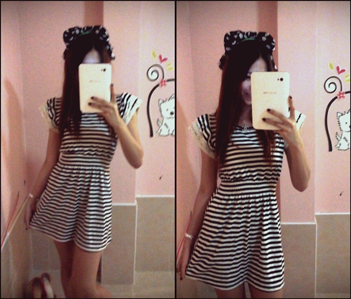 10.USED! 90% เดรสลายทางสีดำ ขาว แขนปักระบายลูกไม้