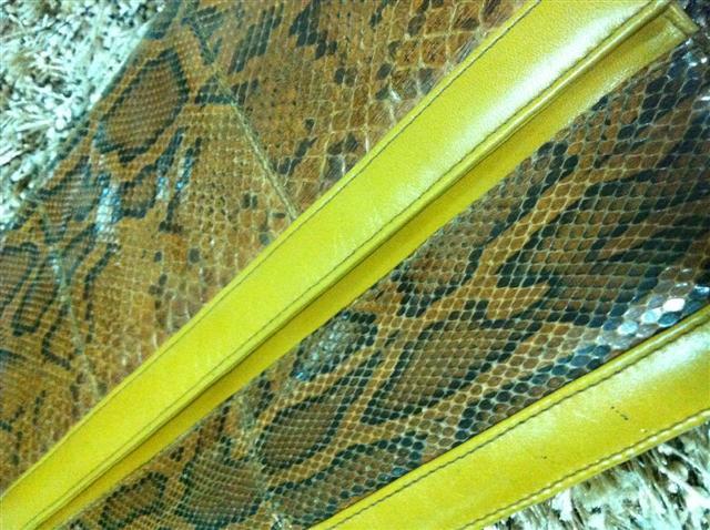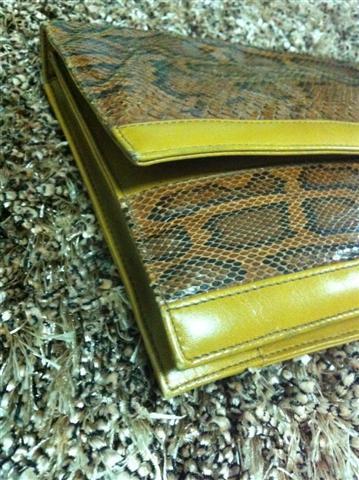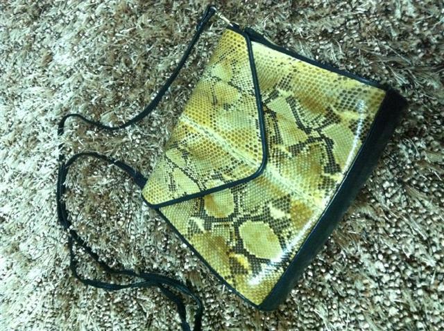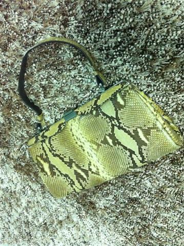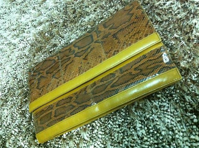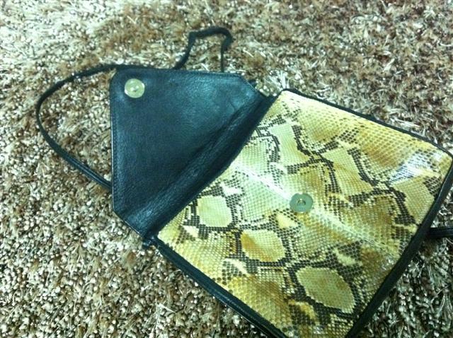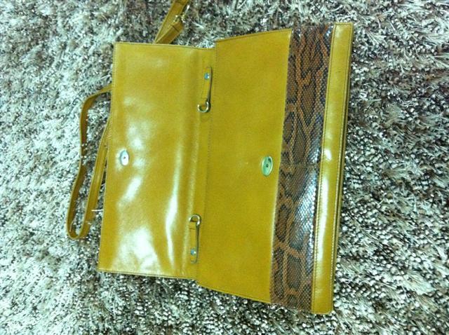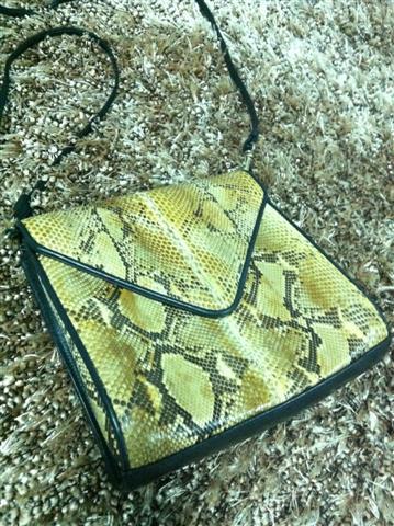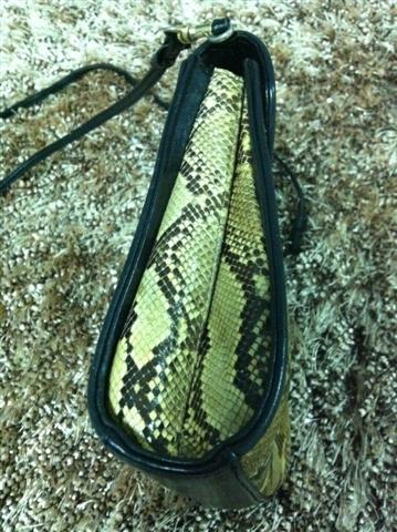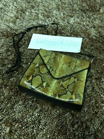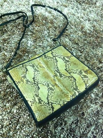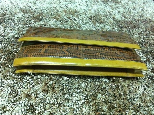 1. กระเป๋ามือสองหนังแท้ ทำด้วยหนังงูแท้สีครีม สะพายข้าง สายยาว เก็บสายทำเป็นคลัชได้ ไซน์ 8 นิ้ว สายยาว 25 นิ้ว