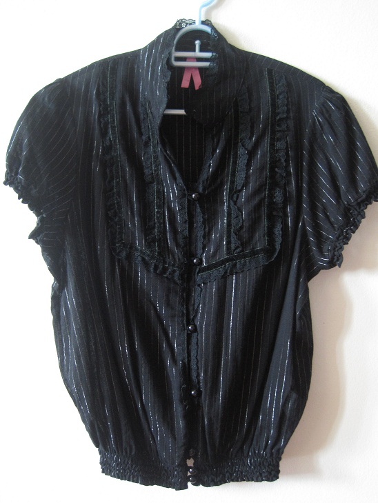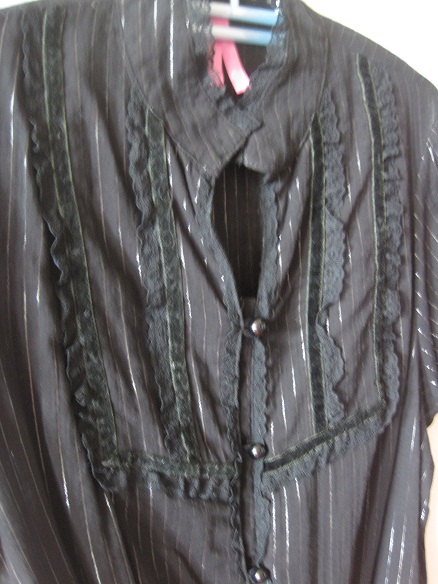 T031. 150 b. เสื้อปกเก๋ เล่นลวดลายด้วยกำมะหยี่และลายทางเงินๆ เป็นทรงจั้มตรงปลายย ผ้าใส่สบายไม่บางมากค่ะ อก 40 นิ้ว ลำตัว 38 นิ้ว จั้มช่วงปลาย 38 นิ้ว ยาว 22.5 นิ้ว