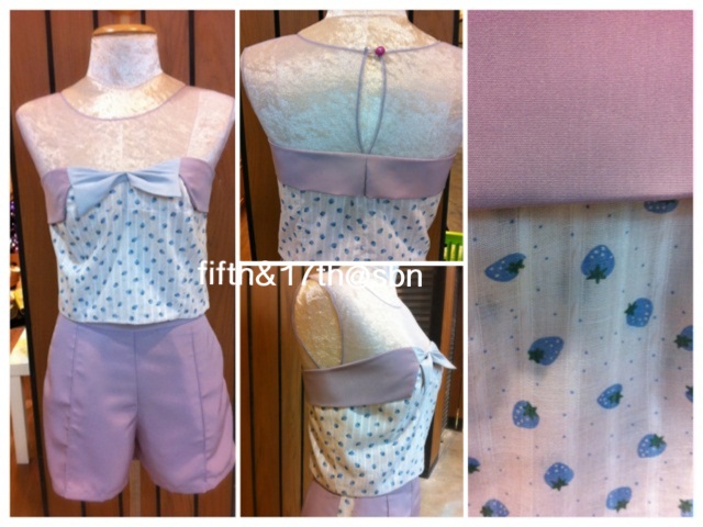 Sexy Secret : เสื้อตัวสั้นผ้าคอตต้อนนอกสีชมพูอ่อนลายสตอร์เบอร์รี่สีฟ้า มีลูกเล่นช่วงอกสีม่วงลาเวนเดอร์ ตกแต่งด้วยโบว์สีขาวมุกผ้าสเปนซิลค์ ช่วงบนแอบเซ๊กซี่ด้วยผ้าตาข่ายเนื้อนิ่มสีม่วงลาเวนเดอร์