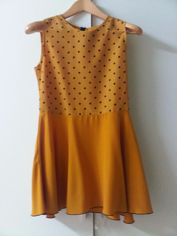 เดรสสีเหลืองมัสตาร์ด ผ้าลื่น มีกระดุมหลัง 1 เม็ด ราคา 250 บาท รวมส่ง