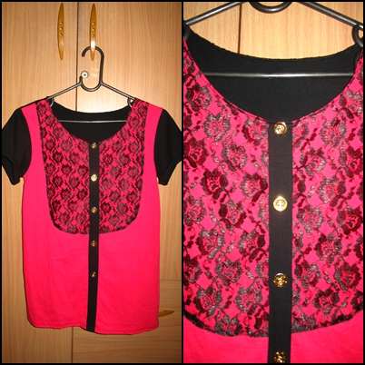 เสื้อยืดวินเทจ แต่งลูกไม้และกระดุมทอง ด้านหลังเป็นสีดำ ใส่กับกางเกงหรือกระโปรงเอวสูงสีดำ สวยมากค่ะ