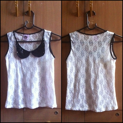 เสื้อยืดวินเทจ แต่งลูกไม้และกระดุมทอง ด้านหลังเป็นสีดำ ใส่กับกางเกงหรือกระโปรงเอวสูงสีดำ สวยมากค่ะ