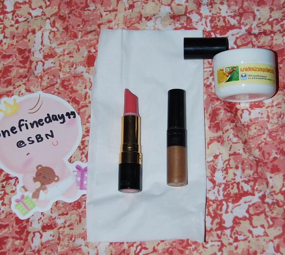 แถมลิปสติกสีสวยของ revlon สี wink for pink ใช้น้อย กับผงขัดผิวสมุนไพรขยิ้มชันขัดผิวของกลุ่มแม่บ้านดอกคำใต้ยังเหลืออยู่เยอะมาก