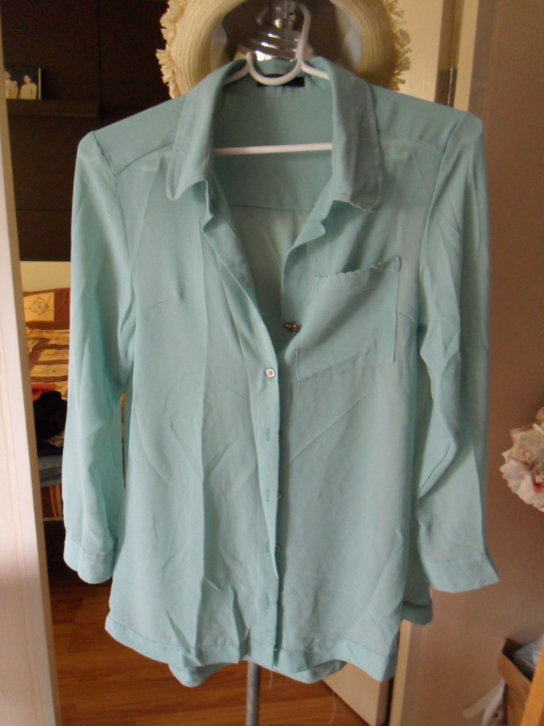 เสื้อเชิ้ตแขนยาวผ้า ซีทรู สีเขียวอ่อน มีดีเทลน่ารัก ตรงกระดุมเม็ดแรกเป็นทองเหลืองรูปโบว์ กระเป๋าเสื้อขอบยักหน้ารักค่ะ 100 บาท