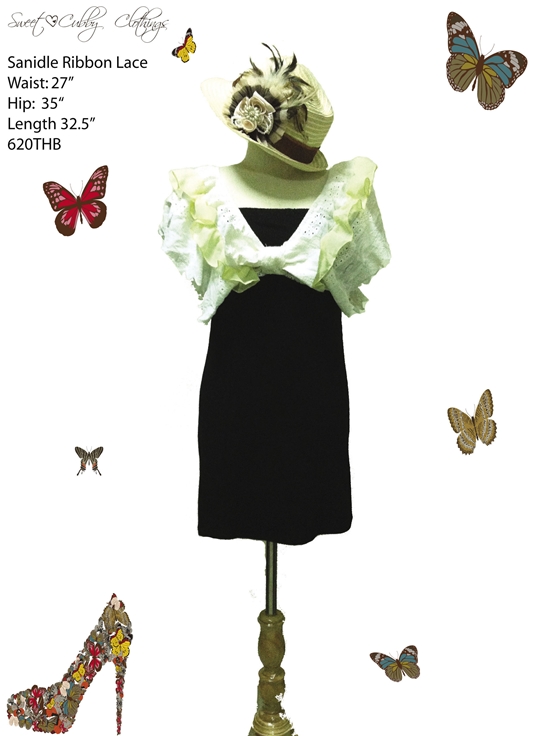 เดรสผ้ายืดสีดำ ช่วงอกเป็นยางยืด เย็บติดกับเสื้อลูกไม้สีขาวมีระบายผ้าชีฟองแถบเล็กๆสีเหลืองอ่อน บริเวณด้านหน้ามีโบว์ลูกไม้