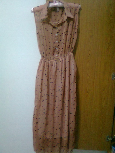ชุดแขนกุดสีน้ำตาล จุดดำ อก 40" เอวยางยืดๆได้ 36" สะโพก 40" ยาว 49"
