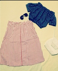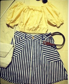 เสื้อเปิดไหล่มีสีเหลือง,น้ำเงิน,ชมพูอ่อน,เขียวทะเล - กระโปรงสวิงลายขวางขาวดำ ,ขาวแดง เอวสูงจ้า (ขายแยกนะคะ)