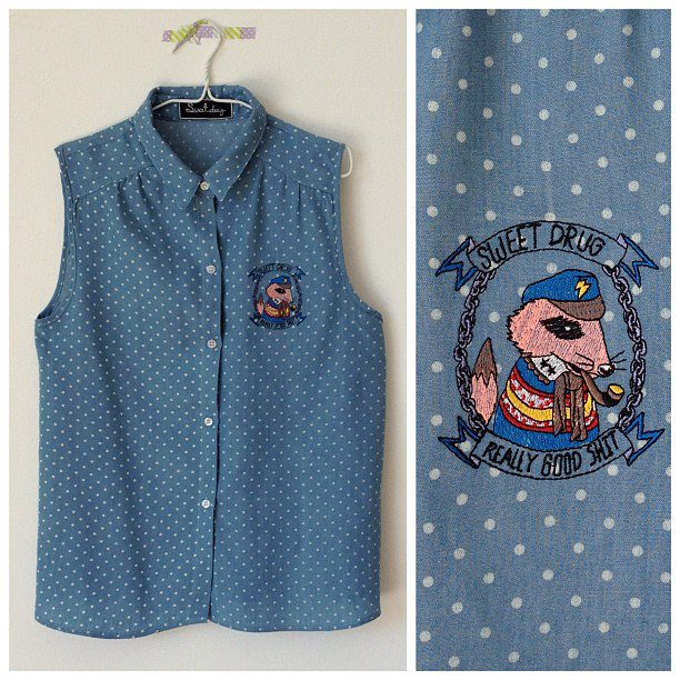 NEW ** เสื้อเชิ๊ตแขนกุดตัวยาวคอบัวแหลม ผ้ายีนส์ลายจุด ปักลายหมาจิ้งจอกที่อก จากร้าน SWEET DRUG