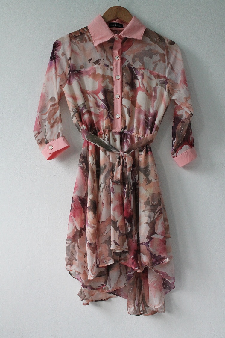 New ** เดรสสีชมพูแขนยาวลายดอกไม้ ชายกระโปรงข้างหน้าสั้น ข้างหลังยาว