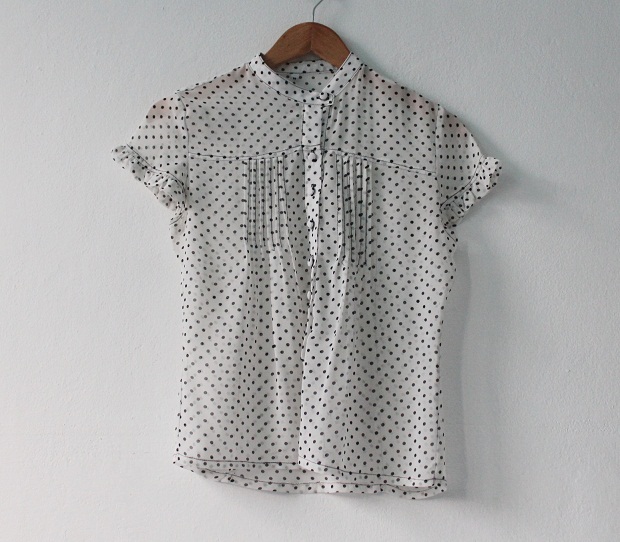 Used 2 - 3 ครั้ง ** เสื้อใส่ไปทำงานสีขาวลายจุด ผ้าชีฟองพริ้ว ๆ ต้องใส่เสื้อข้างในอีกตัวค่ะเพราะว่าบาง