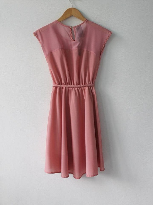 NEW ** เดรสสีชมพูกลีบบัว เอวมียางยืดเฉพาะด้านหลัง ส่วนด้านหน้ามีเชือกสำหรับผูก