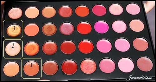 ใช้สีที่ 1 ในพาเลต ตามภาพ ลงทั่วริมฝีปาก สีออกนู้ดส้ม