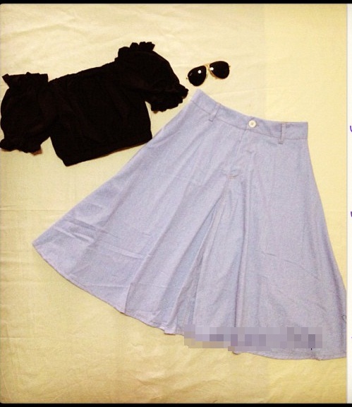 เสื้อเปิดไหล่ สีน้ำเงิน , ดำ กับ กระโปรงเอวสูงลายขวาง (ขายแยกนะคะ)