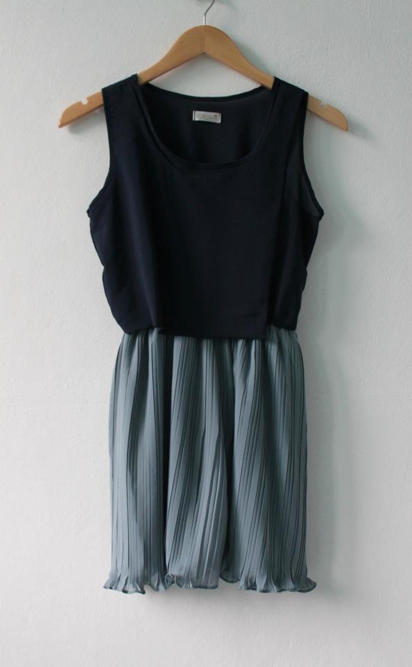 New** Dress สีกรมท่า ช่วงบนเป็นผ้าชีฟองต่อชายกระโปรงพลีท เอวเป็นยางยืด มีซับในช่วงกระโปรง