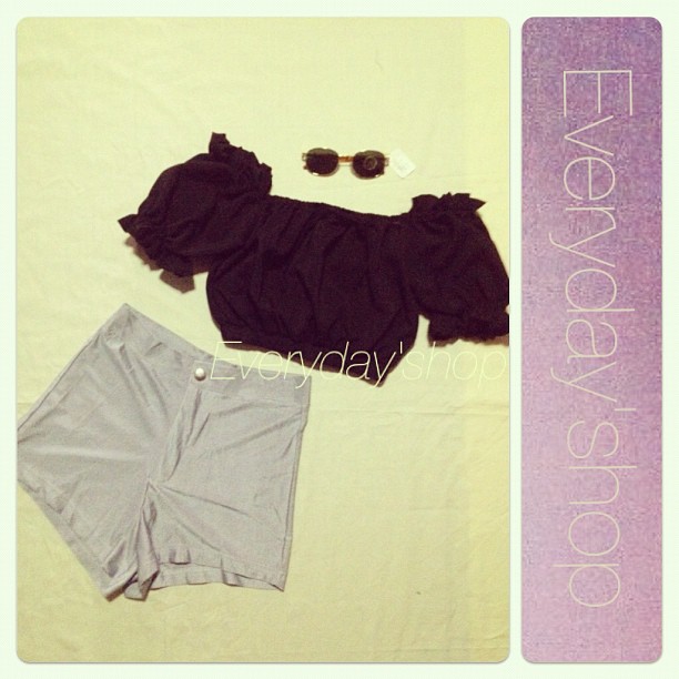 6)เสื้อเปิดไหล่ แขนตุ๊กตาสีดำ (ใส่แล้วน่ารักมาก) กางเกงขาสั้นเอวสูงสีเทา