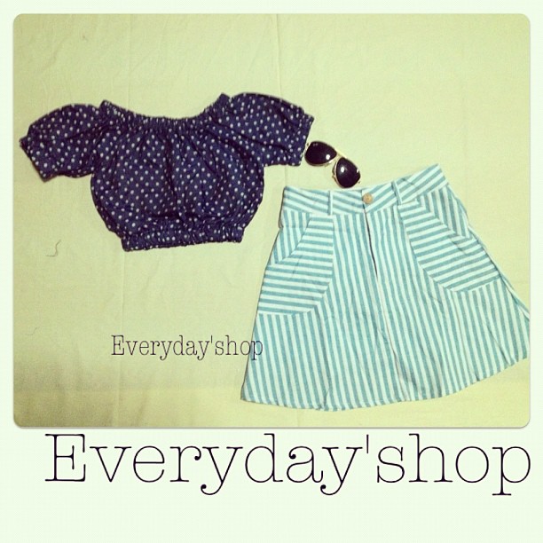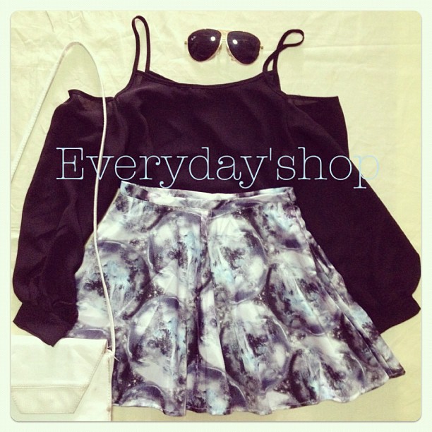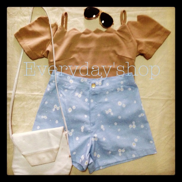เสื้อเปิดไหล่แต่งคอหยัก(มีสีดำด้วยค่ะ) กางเกงขาสั้นสีฟ้าลายดอก
