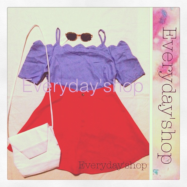 26)เสื้อเปิดไหล่คอหยักสีม่วง กระโปรงเอวสูงสีแดง