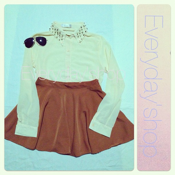 27)เสื้อชีฟองสีเหลืองปกปักหมุด กระโปรงสวิงสีน้ำตาล