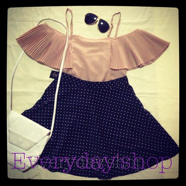 เสื้อเปิดไหล่ระบายแขน กระโปรงลายจุดสีดำ