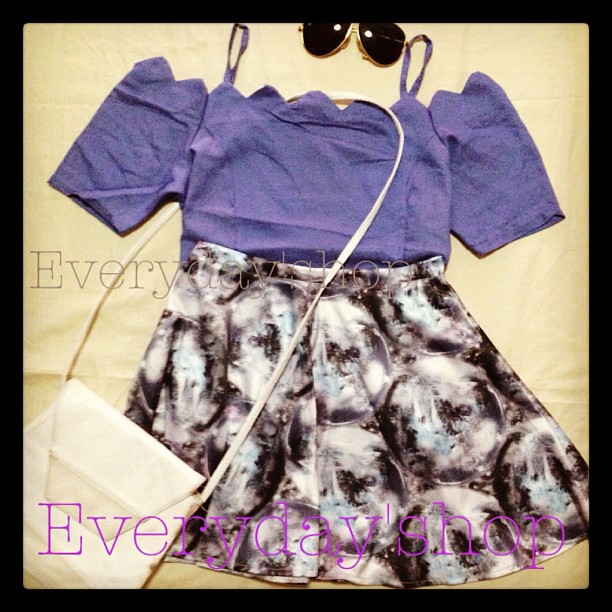 เสื้อเปิดไหล่คอหยัก สีฟ้าอมม่วง กระโปรงพร้อมส่ง s m l