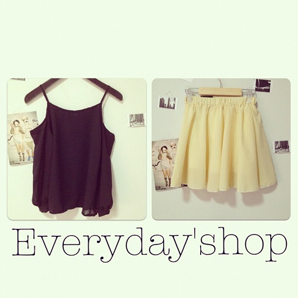 เสื้อสายเดี่ยวสีดำ (มีสีขาวด้วยค่ะ) ผ้าพริ้วสวย ,กระโปรงเอวสูงสีเหลืองมะนาว