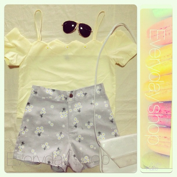 เสื้อตัวสั้นปกสวย กางเกงขาสั้นพาสเทลสีเหลือง
