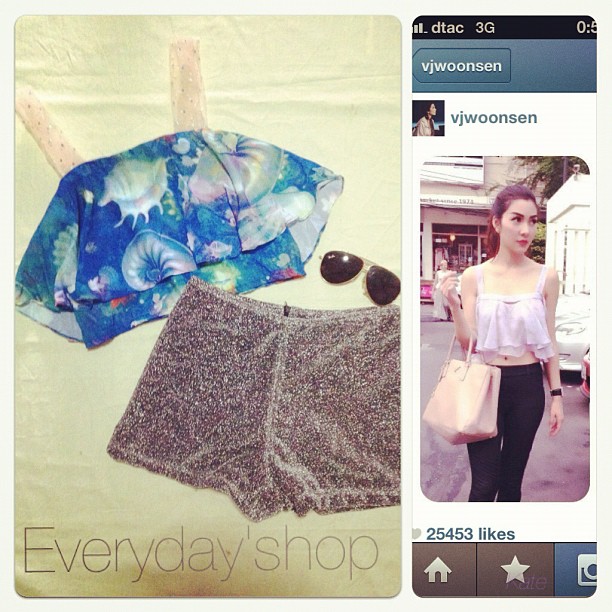 เสื้อเปิดไหล่แต่งคอหยัก(มีสีดำด้วยค่ะ) กางเกงขาสั้นสีฟ้าลายดอก