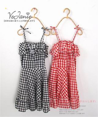 1. เดรสเกาะอกสายผูกบ่าผ้าฝ้ายลาย สก็อตสไตล์เกาหลี เหมือนกับในแบบเลยค่ะตัวเดรสสั้นแบบมีสายสำหรับผูกที่บ่า แต่งระบายสองชั้นที่อก