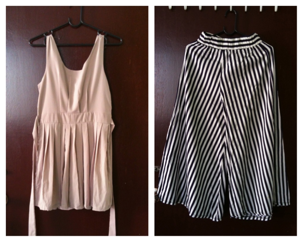 เดรสสีกะปิผ้าดีซับทั้งตัว ราคา 190 บาท / กางเกงกระโปรงลายทางขาวดำ ราคา 100 บาท