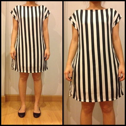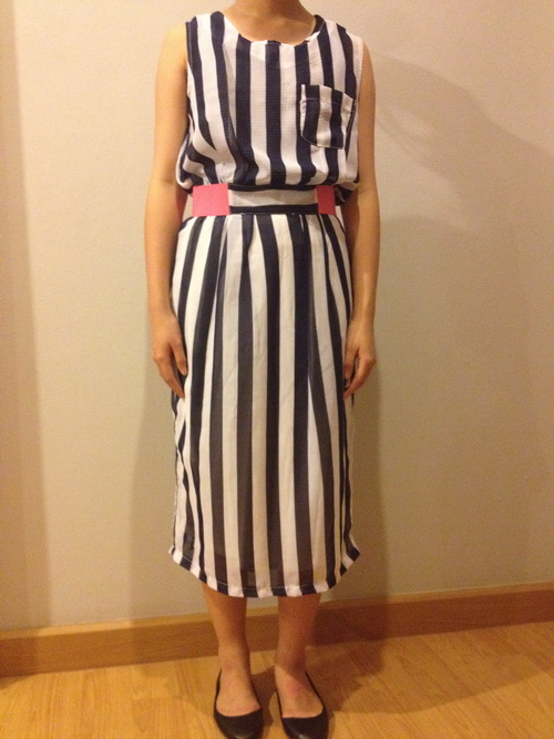 12.เดรสลายทางขาวดำ เป็นผ้าลื่น มีซับในค่ะ ไม่รวมเข็มขัดนะคะ ขาย 250บาท ลดอีกเหลือ 180 บาท