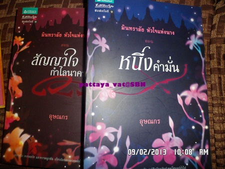 4.นิยายซีรีย์ 2 เล่มจบ เรื่อง มินทราลัย หัวใจแห่งนาง เล่ม 1 ตอน หนึ่งคำมั่น เล่ม 2 สัญญาใจ กำไลนาคราช ผู้แต่งอุษณกร จากสำนักพิมพ์อรุณ กล่าวถึงสมัยพระเจ้าชัยวรมันที่ 7 ก่อนรวมแผ่นดิน ความรักและหน้าที่ หากเลือกได้เพียงหนึ่ง จะทำเช่นไร ราคา 478 บาท==>335 บาท
