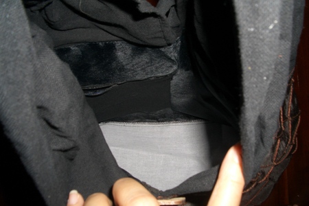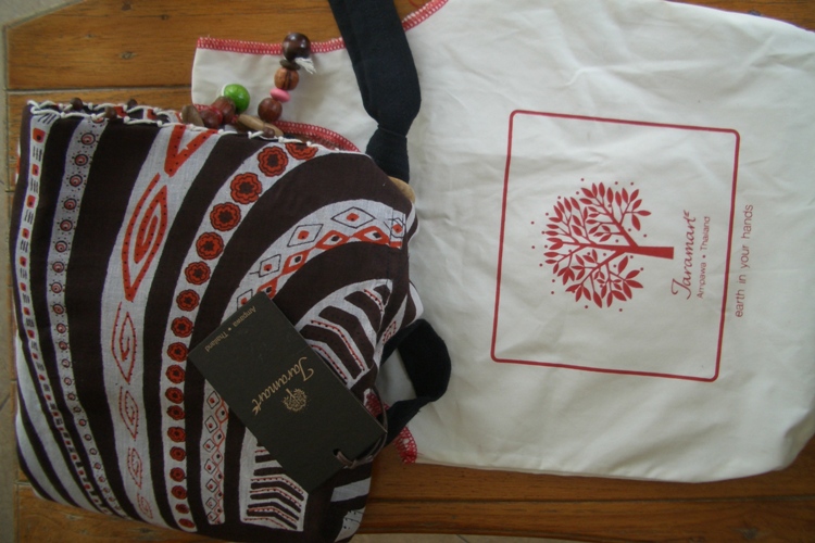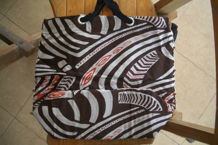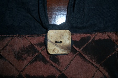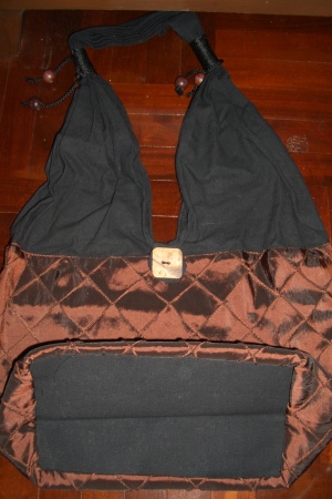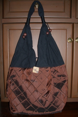 กระเป๋าสะพายสีน้ำตาล ตัวกระเป๋าเป็นผ้าไหม สายสีดำเป็นผ้าฝ้ายค่ะ ราคา 120 บาท