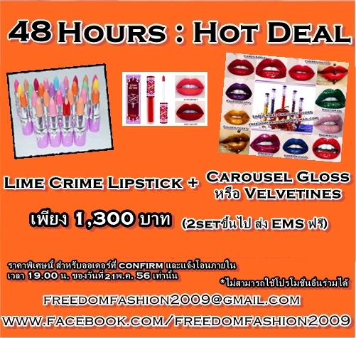 Lime Crime Lipstick Promotion วันนี้ - 24 พ.ค. เนื่องจากเพิ่งได้ราคาพิเศษมาจึงคืนกำไรให้ลูกค้าจ้า สำหรับสีพร้อมส่ง เฉพาะออเดอร์ 3 แท่งขึ้นไป แท่งละ 620 บาทเท่านั้น