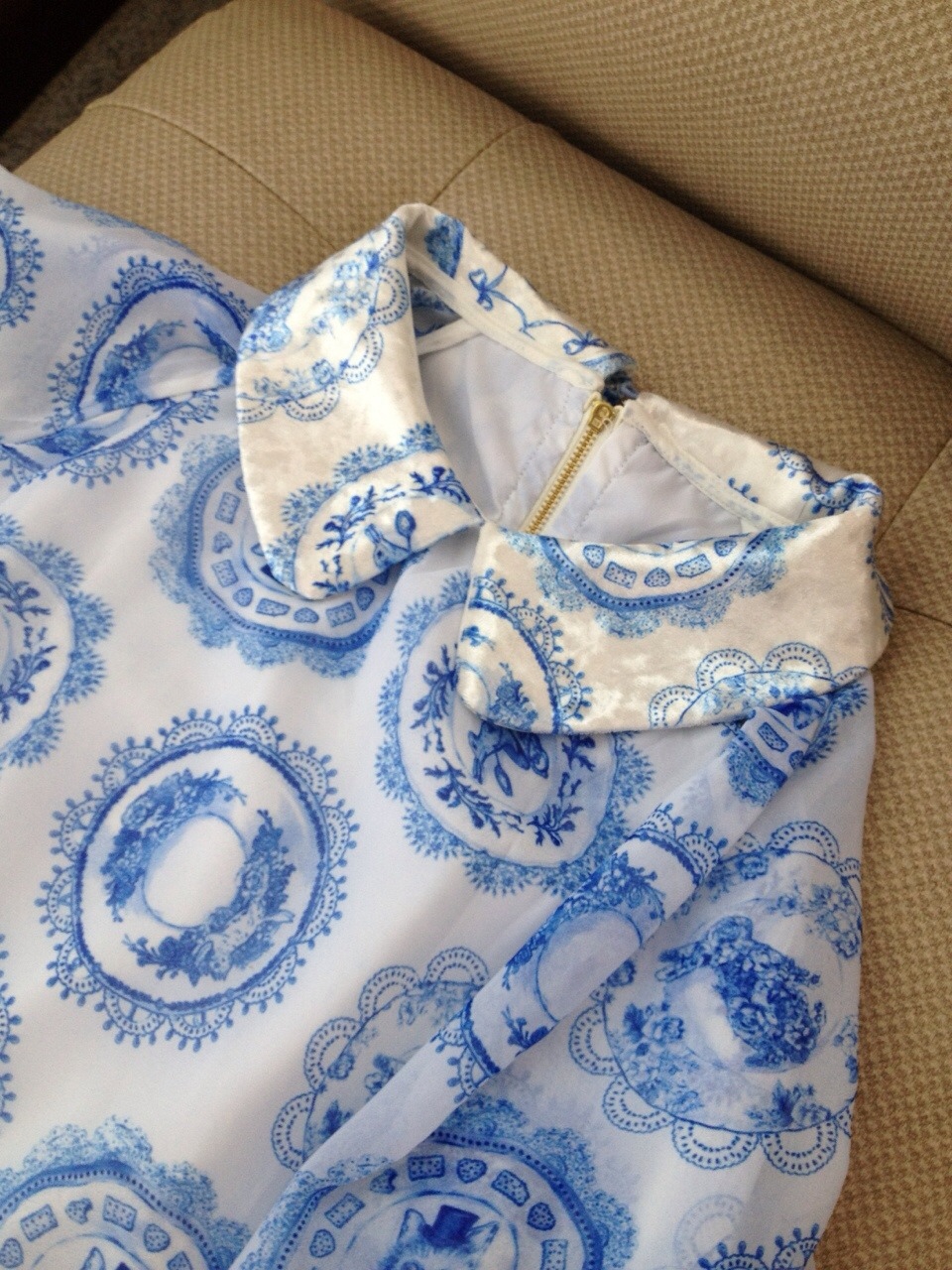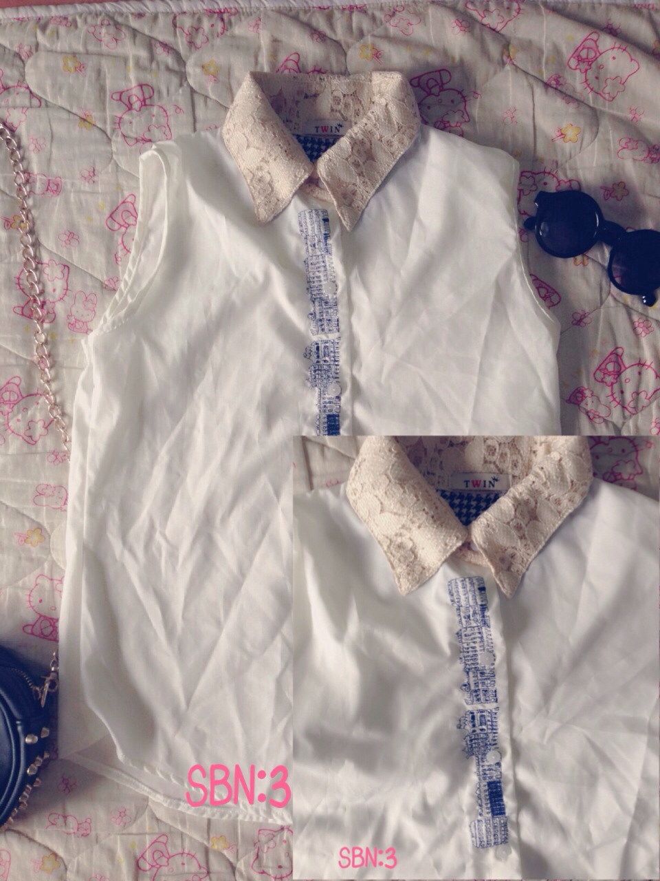 เสื้อเชิ๊ตแขนกุดสีขาว ปกลูกไม้หวานๆ สกีนลายแถบกระดุมบน 200บาท ขายแล้ว