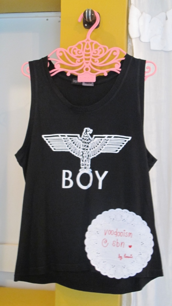 used >> t-shirt แขนกุดสกรีน BOY สีดำ งานดีมากค่ะ ใส่ไป 3 หน ไม่มีตำหนิ freesize ขาย 300 บาท
