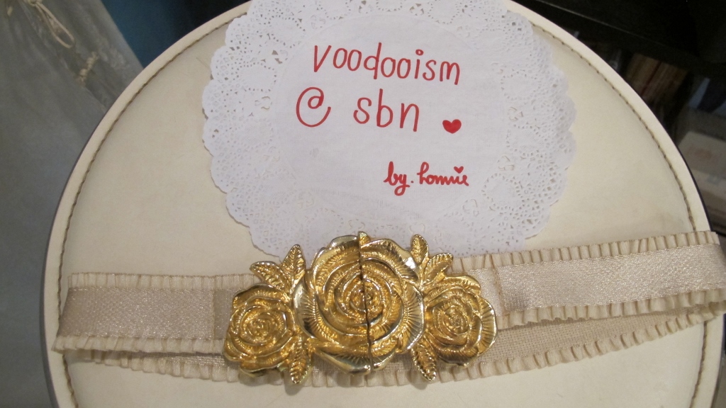 new !! >> เข็มขัด Vintage Style เป็นผ้ายางยืดสีครีม ตรงหัวเข็มขัดเป็นตะขอเกี่ยวกัน หัวเข็มขัดรูปกุหลาบทองเหลือง น่ารักมากๆค่ะ