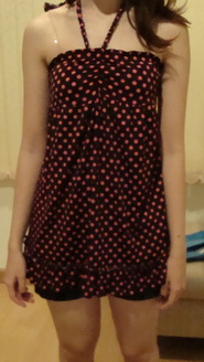 7. เสื้อคล้องคอลายจุด เป็นผ้ายืด สม็อคหลัง ใส่ไปทะเลเก๋ๆค่า เอาสายออกได้ กลัวโป๊ก็ใส่เสื้อยืดขาวข้างในได้ค่ะ น่ารักๆ >> 200