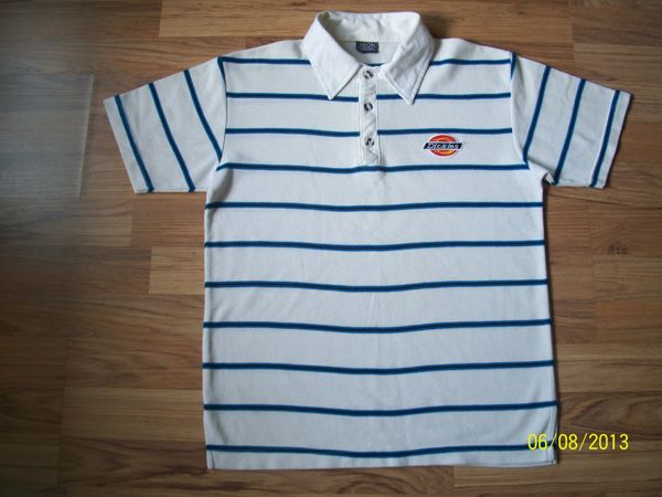 เสื้อโปโล แขนสั้น สีขาวลายทางสีน้ำเงิน สภาพดี อก 18.5 นิ้ว ยาว 23.5 นิ้ว ขาย 50 บาท