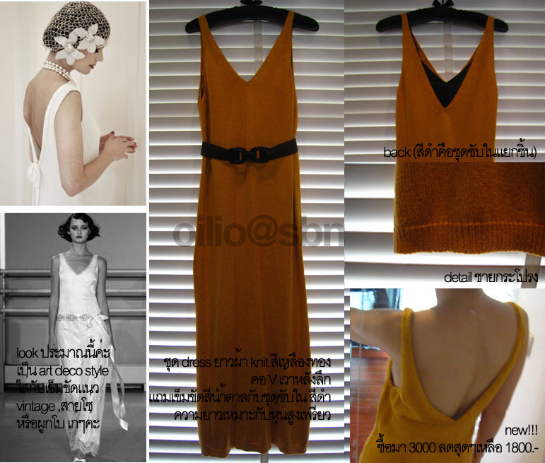ตัวเก๋ไก๋ dress ยาว ผ้า knit สีทองแนว 20s เว้าหลัง sexy ทีเดียว ซื้อมาจากสยามยังไม่ได้ใส่เลยค่ะ เหมาะกะสาวความสูง 165 up ค่ะแต่มีหน้าอกซัักหน่อยจะใส่สวยค่ะ ( ที่ไม่ได้ใส่ ก็เพราะอย่างงี้แหละค่า T_T)