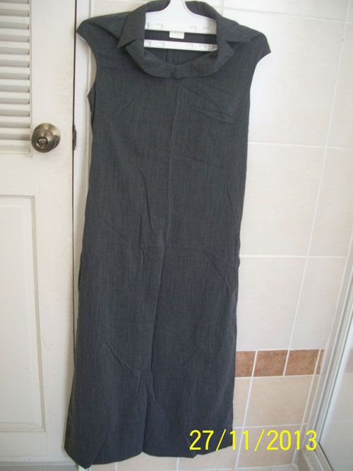 ชุดแซกสีเทาดำ มีปก ของ Chikita มีซิบด้านข้าง อก 32 นิ้ว เอว 29 นิ้ว ความยาว 50 นิ้ว สภาพดีมาก ผ้าไม่หนาใส่สบาย ขาย 70 บาท