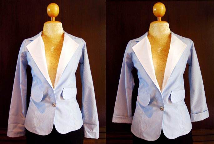 Blazer สีฟ้าลายทางเส้นเล็กๆ ปกแต่งผ้าสีขาว แขนพับได้นะคะ