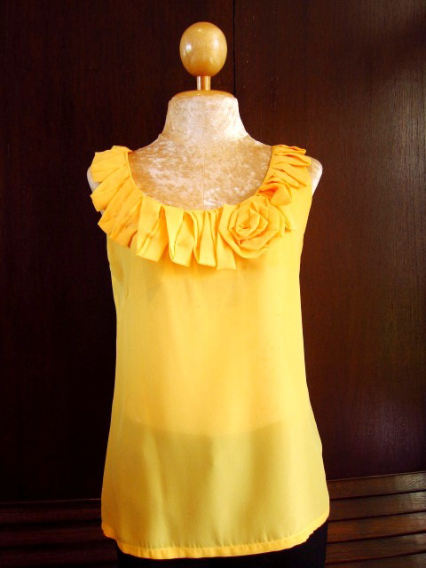 เสื้อแขนกุด สีเหลืองมัสตาส แต่งระบายช่วงคอ ตัวนี้มีซิปซ่อนด้านข้างนะคะ