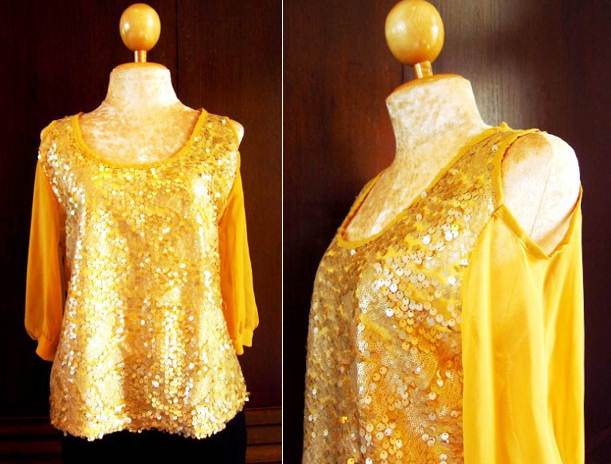 เสื้อแขนสามส่วนสีเหลือมัสตาล แต่งเกล็ดปลาสีทองด้านหน้า ตัวนี้ไหล่เว้านะคะ