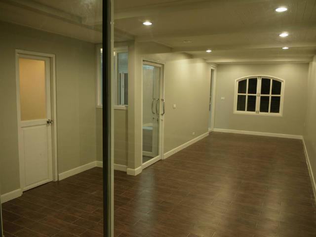 ห้องที่เป็นพื้นที่ทำงาน (อยู่หลังประตูเหล็กม้วน) ที่พัฒนามาจากพื้นที่เปิด สำหรับเป็นโรงรถ มีพื้นที่ใช้งานทั้งหมด 30 ตารางเมตร มีเพดานสูง 3 เมตร กระเบื้องที่ใช้ปูพื้น เป็นกระเบื้องที่ออกแบบให้ใช้ปูพื้นภายนอกอาคาร ที่รับแรงได้ 200 กิโลกรัม ต่อ ตารางนิ้ว และมีลายคล้ายหินธรรมชาติ ซึ่ง เมื่อนำมาปูลาย 45 องศา จะทำให้มีลักษณะพื้น เหมือนพื้นของอาคารไสตล์ยุโรป ที่ทำด้วยหิน