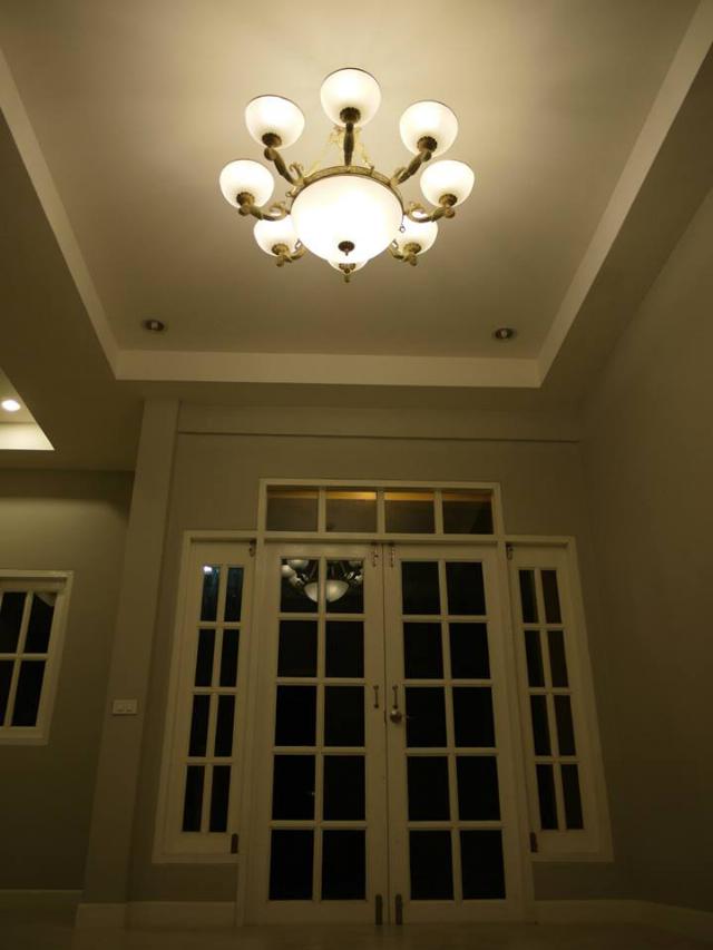 ภาพแถมท้าย ส่วนโคมไฟเพดานและประตูหน้าบ้าน บริเวณห้องโถงชั้นล่าง เมื่อมองออกไปจากตัวบ้านครับ