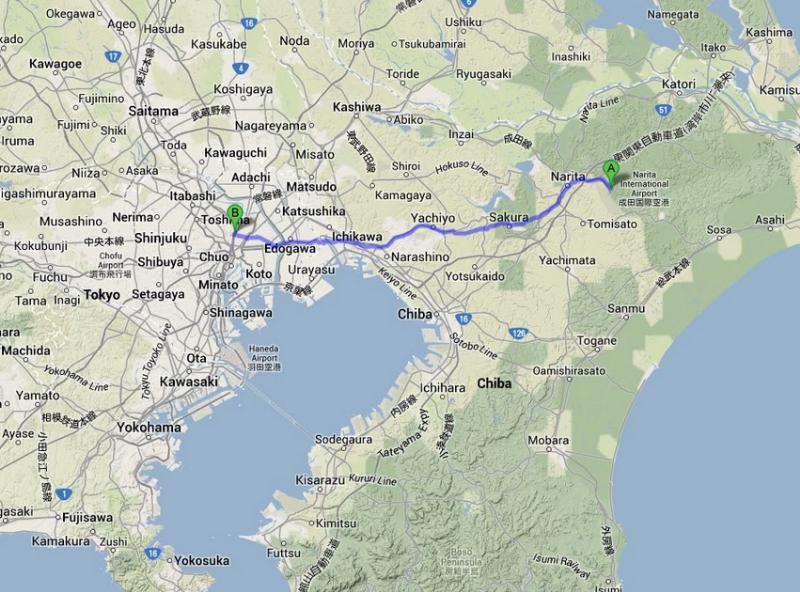 จริงๆแล้ว อยากจะบอกว่า มันไม่ใช่เลยค่ะ สำหรับที่นี่ ดูในแผนที่ด้านบน จะเห็นว่า สนามบินนาริตะ(สังเกตที่จุด A ในแผนที่)นั้น ตั้งอยู่ที่เมืองนาริตะ (เมืองในที่นี้ น่าจะเทียบเท่ากับ อำเภอ ในบ้านเรา) ซึ่งอยู่ในจังหวัดจิบะ (ขอเรียกว่าจังหวัดเหมือนบ้านเรานะคะ โตเกียวเองก็เป็นจังหวัดค่ะ) ที่อยู่ด้านตะวันออกของกรุงโตเกียว